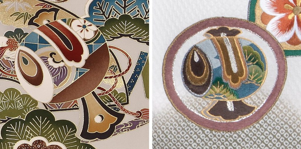 柄が染め上げられた生地に金や銀の箔、金泥や金粉などを密着加工することを金彩加工と言います。さまざまな技法があり、表現の幅も多彩。着物の柄がより美しくゴージャスに映え、晴れ着の品格を高めます。
