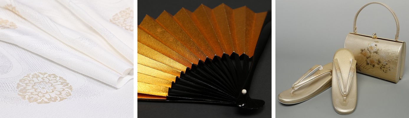 五つ紋の色留袖に合わせる帯は、錦織や唐織など金、銀、箔を配した格調の高いものを選びましょう。帯揚げ、帯締めは礼装の基本である白を選べば間違いありませんが、白地に金や銀が入っているものでも問題ありません。祝い用の扇(末広)は骨が黒塗りで地紙が金色のものがふさわしく、通常は体の左側の帯に差しておきます。バッグと草履は佐賀錦や上品なエナメルなど礼装用のセットになったもので合わせます。